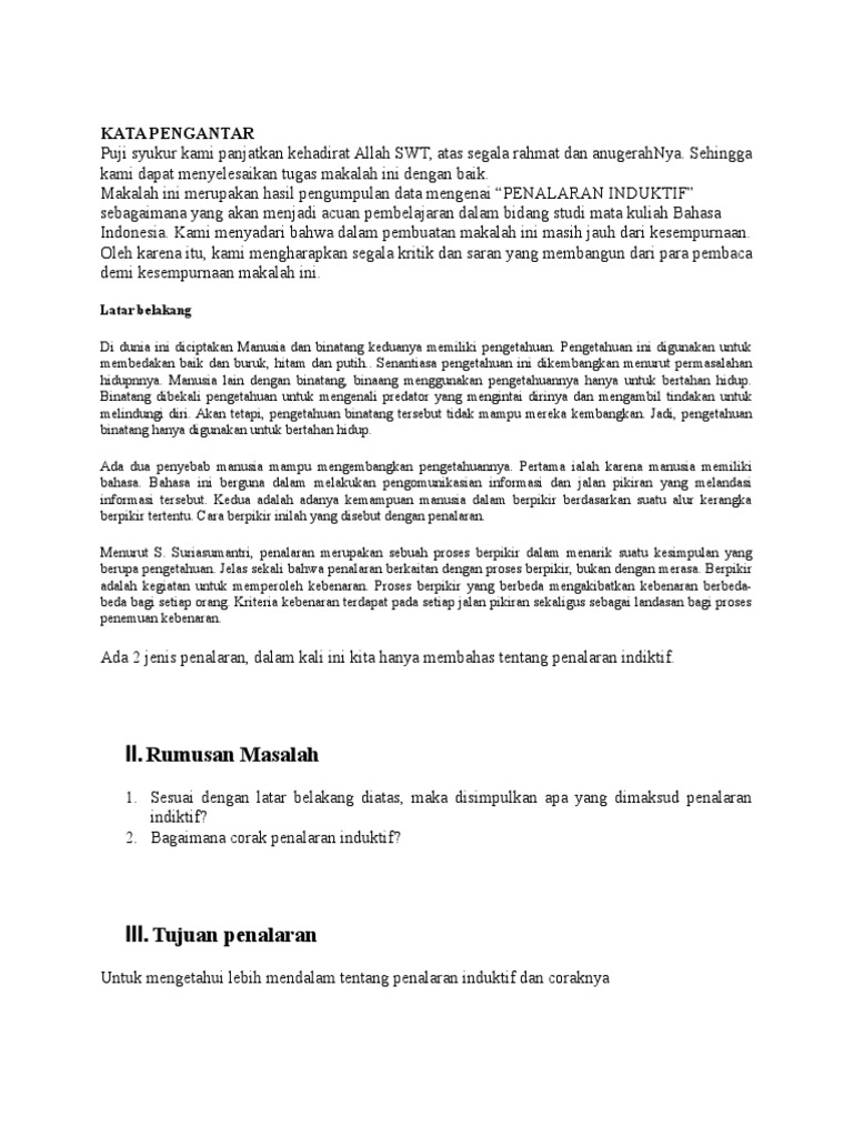 Dalam hal ini penalaran induktif merupakan kebalikan dari penalaran deduktif. Misalnya, kita menjatuhkan buku dan teryata jatuh ke bawah, kita menjatuhkan. Contoh argumen deduktif, argumen yang berupaya menjamin validitas penalaran dengan menunjukkan bahwa kesimpulan yang dicapai adalah benar karena dalam contoh ini dipahami bahwa semua lebah menyengat. 3.3.1 handphone dalam kehidupan manusia. Penalaran induktif berarti memasukkan data ke otak dengan suatu hal yang umum ke khusus.