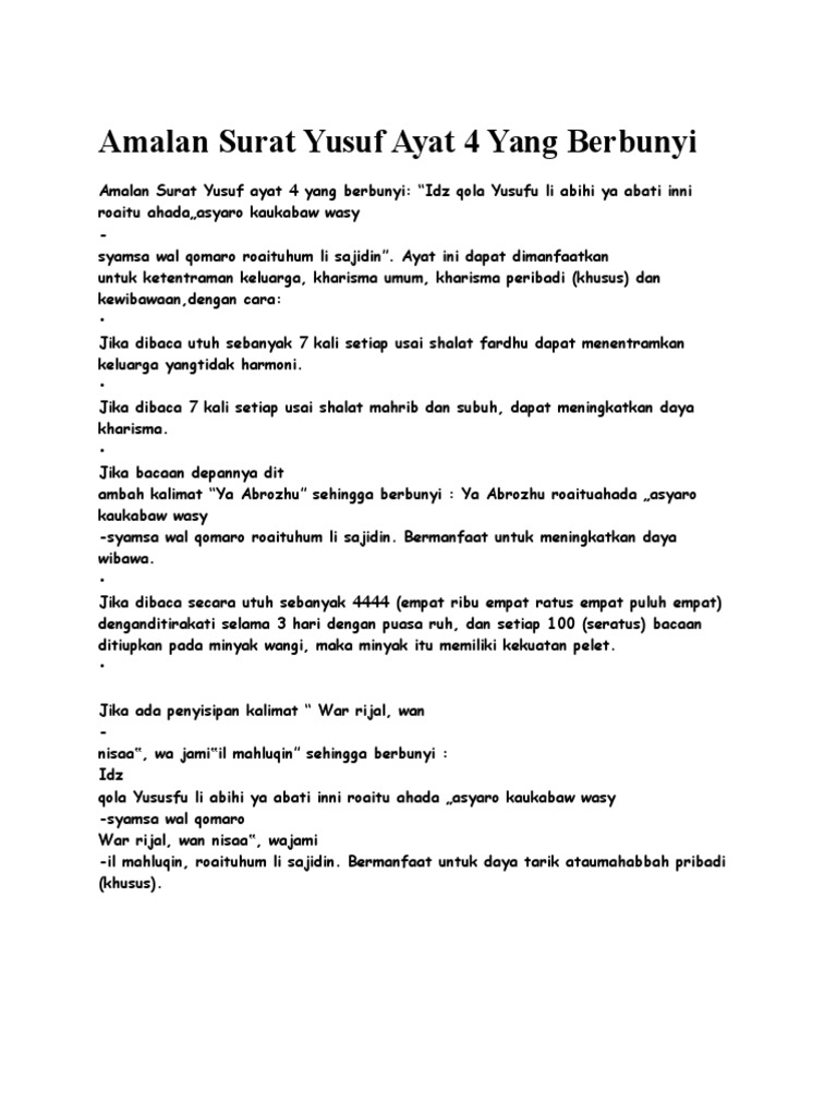 Mungkin bagi pembaca sudah tidak ajaib lagi mendengar. Surat yusuf ayat 4 dan 31 yang merupakan bagian dari isi al qur'an ini, ternyata juga banyak ulama hikmah dan guru spiritual. Dalam kesempatan sekarang, sedikit mengembangkan amalan yang dahsyat sekali. (ingatlah), ketika yusuf berkata kepada ayahnya: Amalan ini merupakan salah satu amalan yang dikenal oleh pesantren, yaitu amalan mahabbah surat yusuf dari ayat 4.