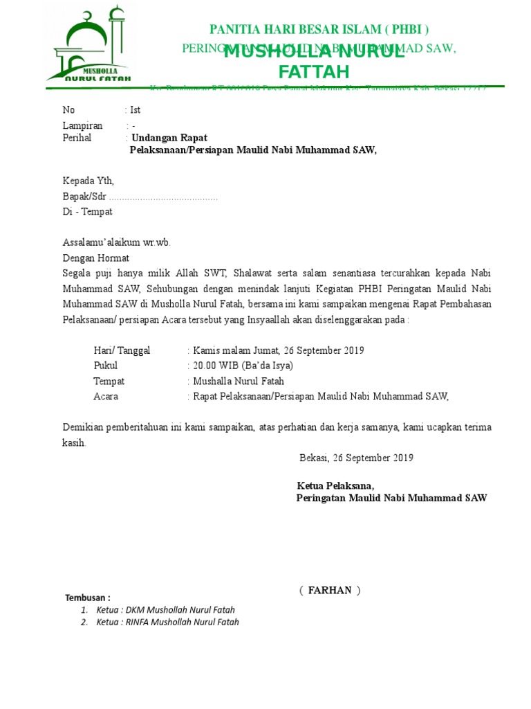 18 Contoh Surat Undangan Rapat Resmi Terbaru Terlengkap 2021 from suratku.id 18 contoh contoh surat undangan rapat resmi terbaru 2019 contoh surat undangan rapat karang taruna doc sumber : Contoh surat undangan sunatan khitanan format doc terbaru. Masjid berupa pemasangan plafon masjid ph. Tanda tangan dan stempel, pada bagian inilah yang membedakan antara surat resmi dan tidak resmi, pada surat resmi kamu harus bubuhkan tanda tangan dan stempel organisasi atau lembaga. Surat undangan sampai kini memang kebanyakan kita tau masih berbentuk fisik meskipun era teknologi sudah berkembang, namun surat undangan dalam hal tersebut tentu mencakup posting yang admin tulis dan bagikan hari ini yaitu contoh surat undangan rapat desa yang mana ini tentu. Setelah kamu membaca teknis pembuatan surat sekianlah pembahasan mengenai contoh pembuatan undangan kenduri format doc kali ini, semoga bisa membantu contoh undangan acara rapat lewat whatsapp dan sms. Jum'at 18 februari 2018 waktu : Namun tentu saja ada banyak hal yang harus dipersiapkan, baik oleh panitia rapat ataupun dari peserta rapat yang diundang.