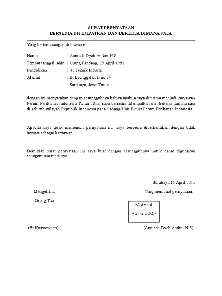 Cara penulisan dan contoh surat pernyataan kesanggupan ditempatkan dimana saja. Meskipun hal yang dicantumkan dalam surat pernyataan bisa saja sederhana, tapi banyak orang yang masih tidak tahu, bagaimana cara membuat surat pernyataan? Dunia pekerjaan juga ada yang membutuhkan surat pernyataan orang tua untuk menyanggupi keputusan pekerjaan yang diberikan dan bersedia ditempatkan dimana saja. Selain itu, ada juga pengertian lain. Share this demikian surat pernyataan ini saya buat sesuai dengan keadaan dan fakta yang sebenarnya. Surat pernyataan bersedia ditempatkan dimana saja xxx. Terimakasih telah berkunjung di gawe cv pada post contoh surat pernyataan bersedia ditempatkan. Namun ada kalanya pernyataan yang akan diberikan harus dengan menggunakan surat, baik itu menyatakan diri sendiri ataupun menyatakan tentang orang lain. Surat pernyataan bersedia untuk ditempatkan di seluruh wilayah nkri dan semua tugas/fungsi kepolisian saya yang bertanda tangan di bawah ini : Hingga kini, surat pernyataan masih sangat dibutuhkan, karenanya contoh surat pernyataan yang baik dan benar wajib diketahui banyak orang. Bagaimana contoh surat pernyataan yang benar? Anda sedang membuka postingan contoh surat pernyataan bersedia ditempatkan yang berada pada kategori contoh surat dengan tag postingan berikut contoh. Beberapa hal yang wajib ada dalam surat pernyataan penempatan kerja ini yakni: